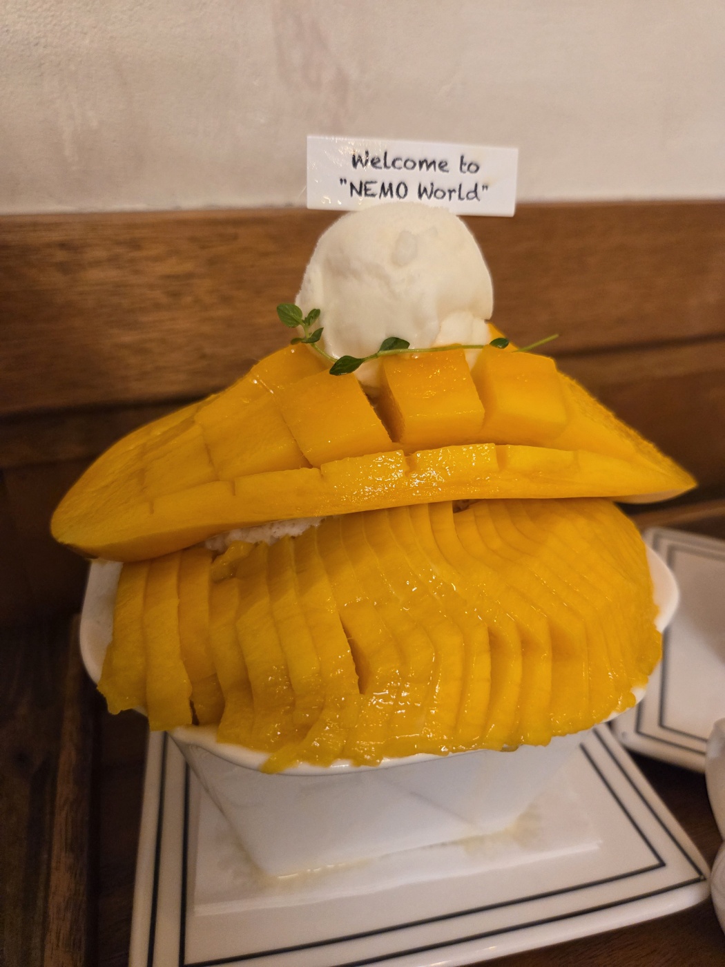 주요 메뉴: 망고빙수, 생크림 케이크, 네모라떼, 파르페, 커피류